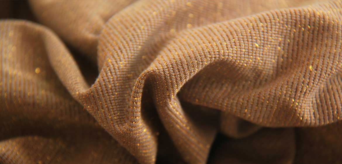 This single jersey fabric of 180 GSM, is made of lurex and viscose. The lurex content gives the fabric a light metallic sheen. Mostly used for making women's fashion tops, it is available both as trim fabric as well as whole garment.